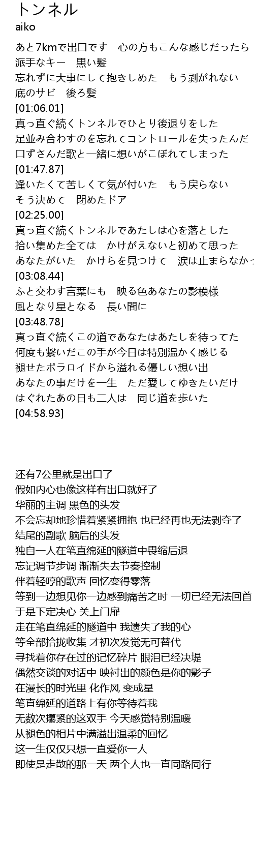 | [02:26.67] | 真っ直ぐ続くトンネルであたしは心を落とした |