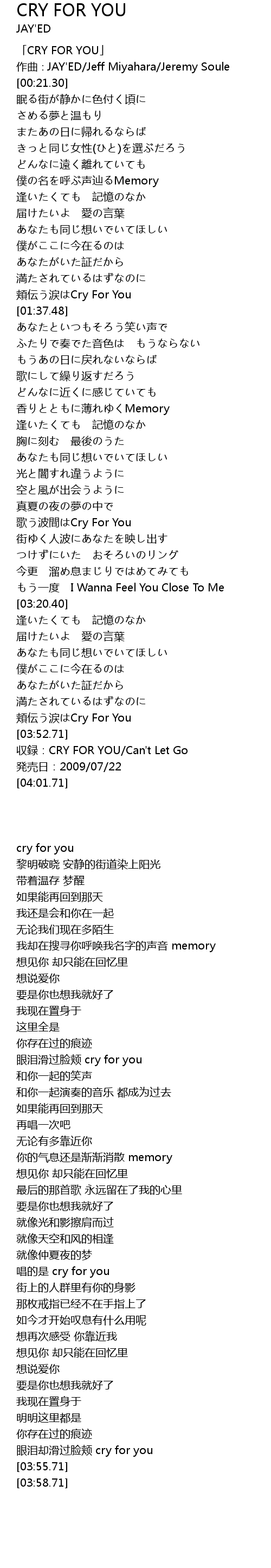 | [03:55.71] | shou lu: CRY FOR YOU Can' t Let Go |