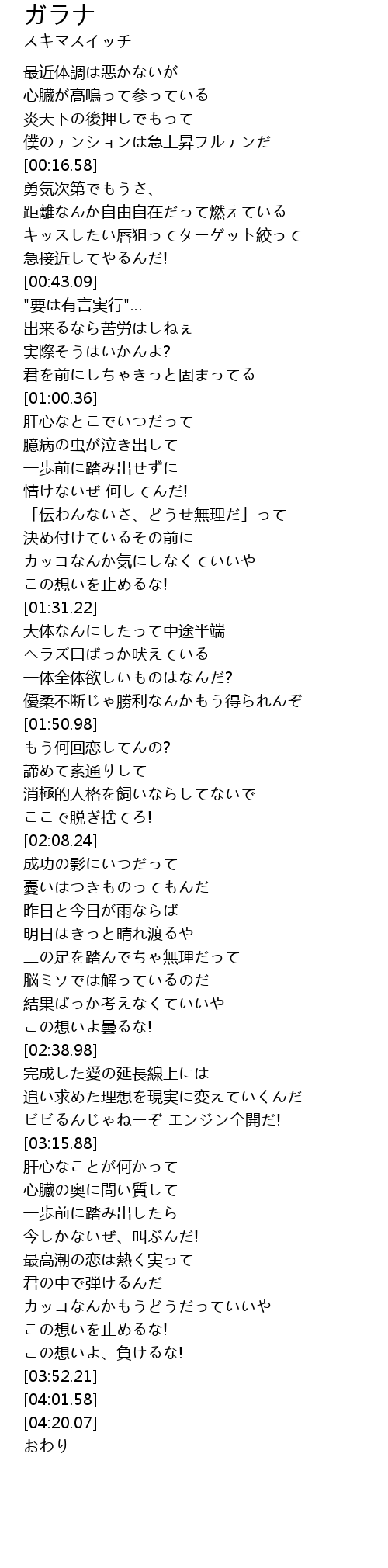 | [00:11.47] | 僕のテンションは急上昇フルテンだ |