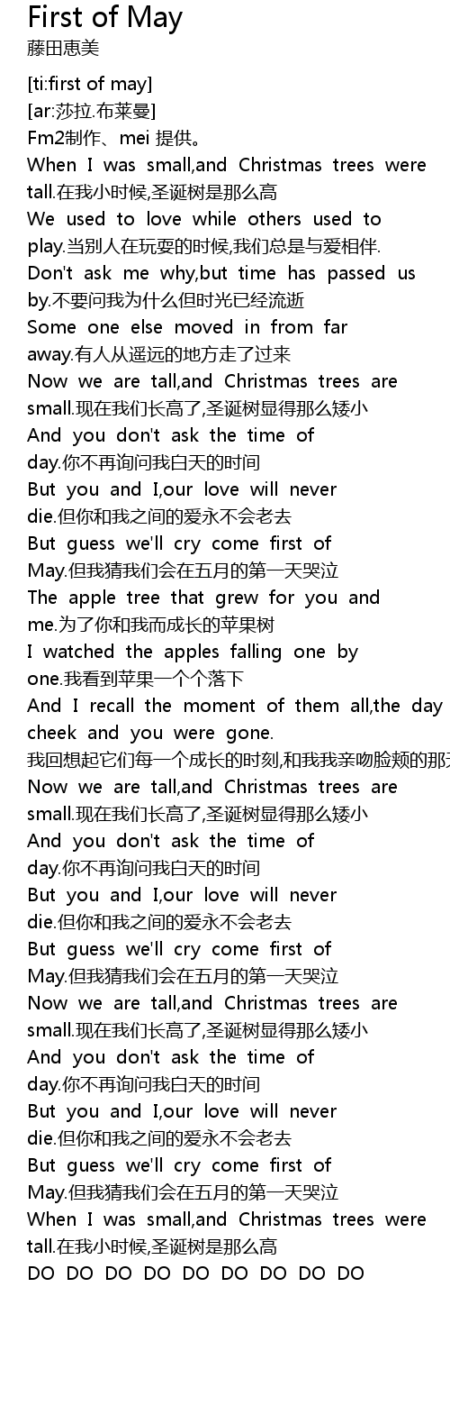 | [03:10.795] | But guess we' ll cry come first of May. dan wo cai wo men hui zai wu yue de di yi tian ku qi |