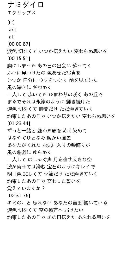 | [00:02.02] | 涙色 切なくて いつか伝えたい 変わらぬ思いを |