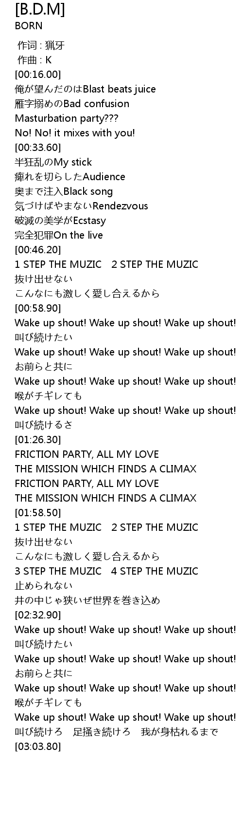 | [02:33.35] | Wake up shout! Wake up shout! Wake up shout! |