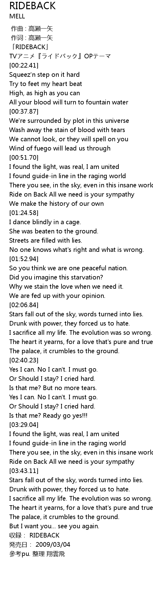 | [00:11.41] | TVアニメ『ライドバック』OPテーマ |