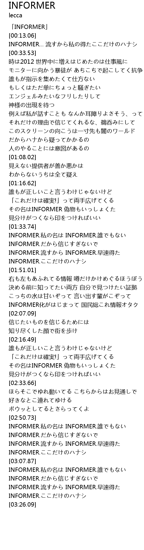 | [03:08.53] | INFORMER.私の名は INFORMER.誰でもない |