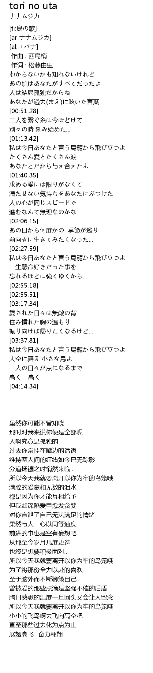 | [03:51.74] | dà kōng wǔ xiǎo niǎo |