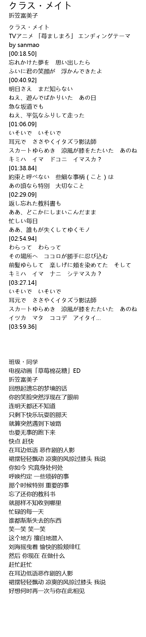 | [03:39.76] | スカートゆらめき 涼風が膝をたたいた あのね |