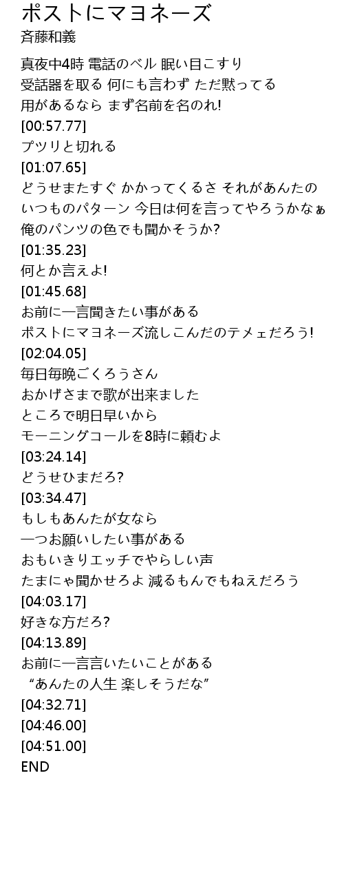 | [01:59.05] | ポストにマヨネーズ流しこんだのテメェだろう! |