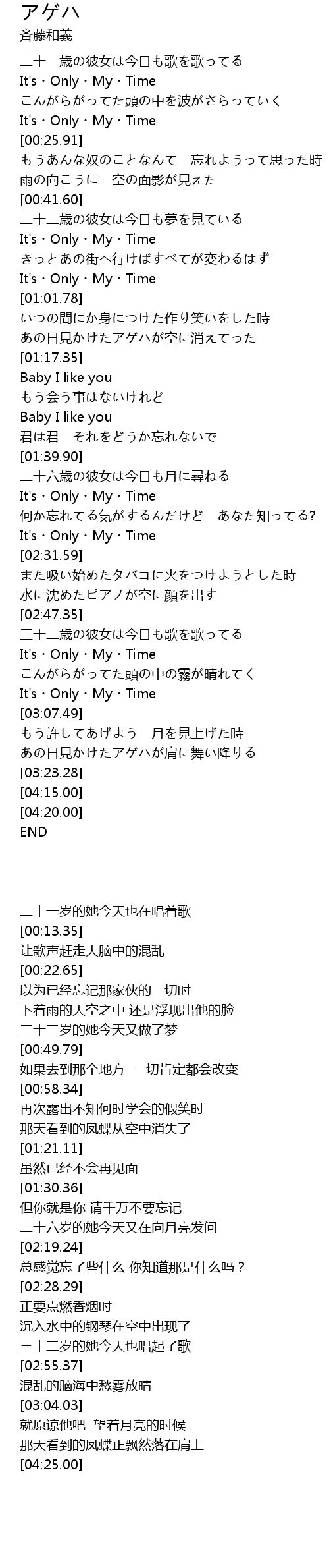 | [00:22.65] | It's・Only・My・Time |