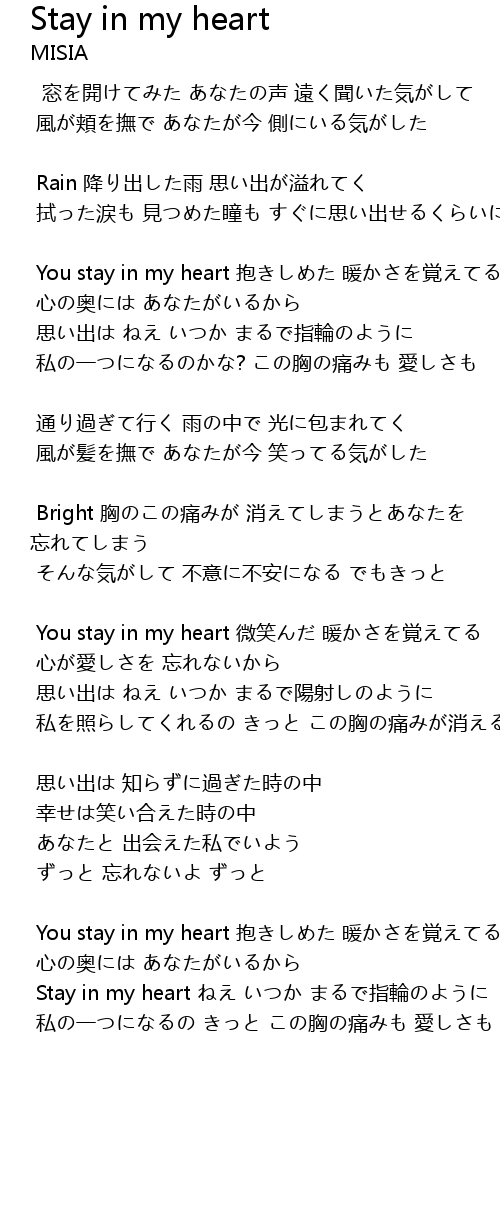 | You stay in my heart 微笑んだ 暖かさを覚えてる | |