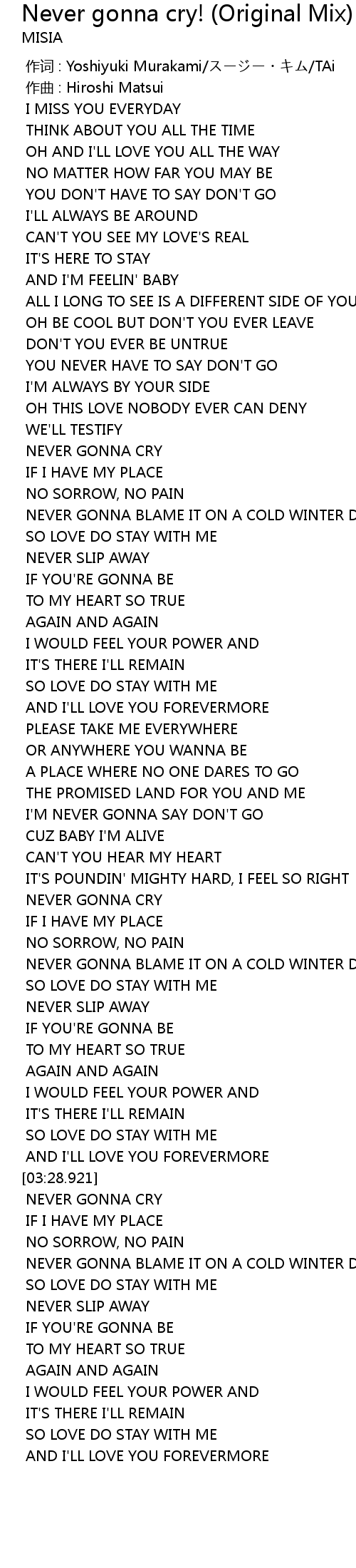 | [02:42.228] | I'M NEVER GONNA SAY DON'T GO |