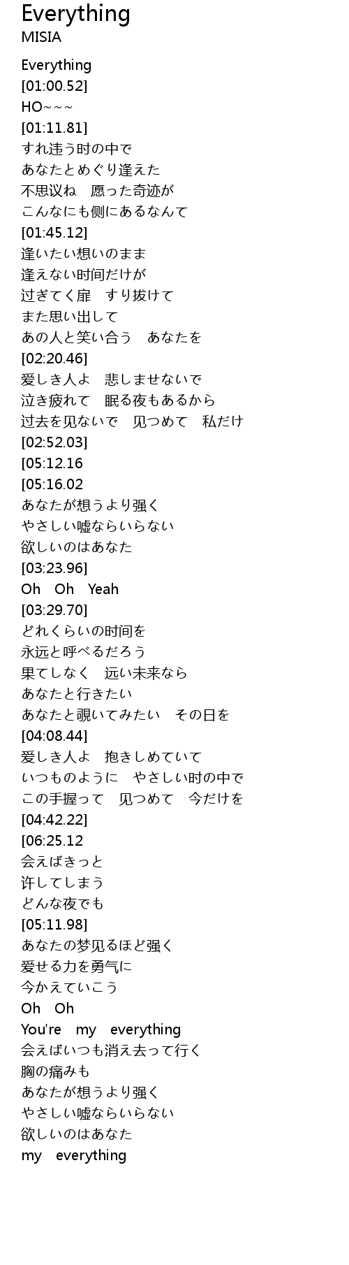 | [02:54.14][05:12.16][04:43.23][06:17.99][06:46.81][07:17.78][07:26.81] | You're everything |