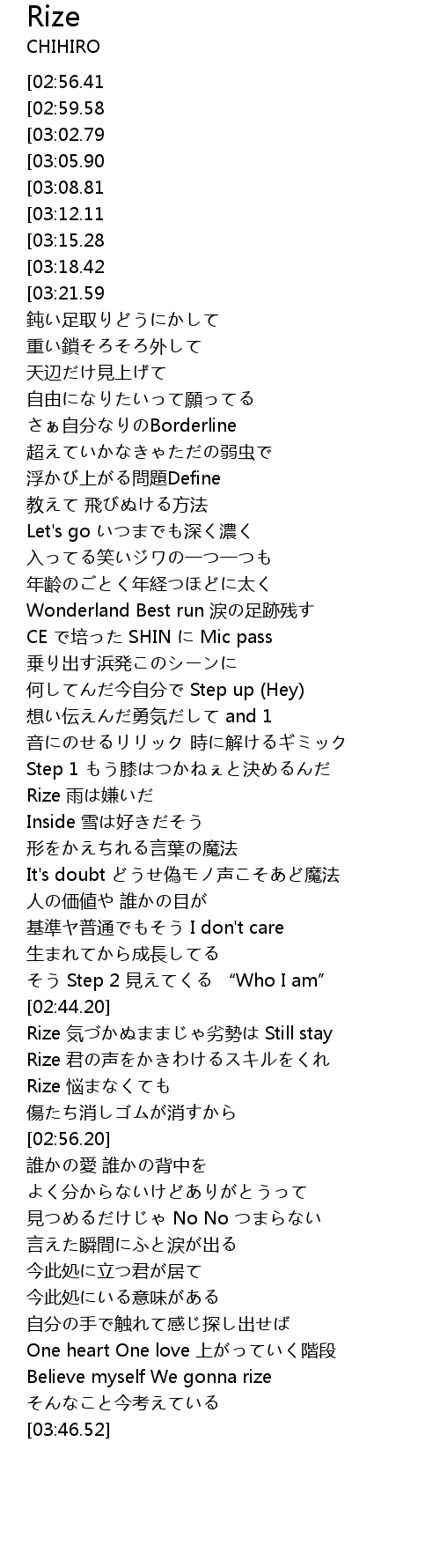 | [02:47.41] | Rize 君の声をかきわけるスキルをくれ |