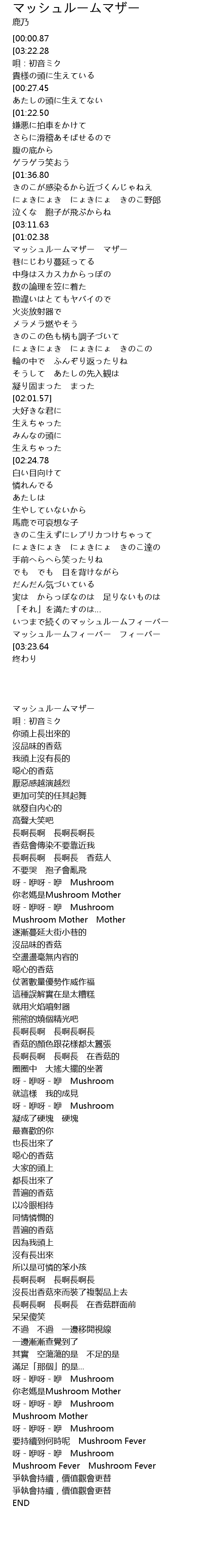 | [03:10.25][00:00.87] | マッシュルームマザー |