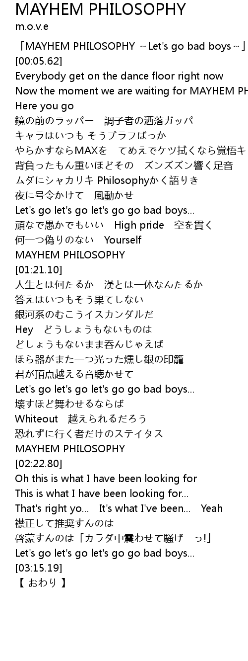 | [00:01.62] | 「MAYHEM PHILOSOPHY ~Let's go bad boys~」 |