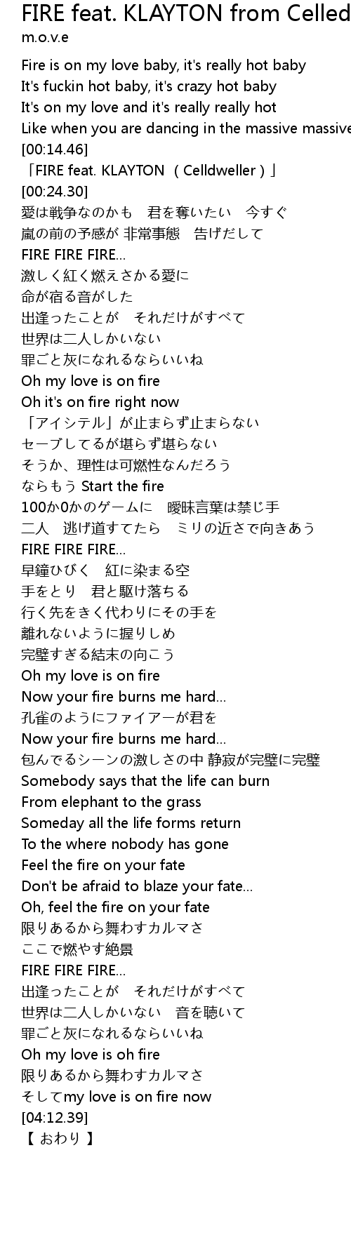 | [00:00.00] | Fire is on my love baby, it's really hot baby |