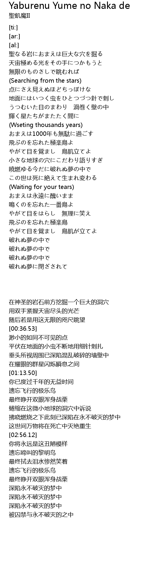 | [02:42.66] | 暁燃ゆる今だに破れぬ夢の中で |