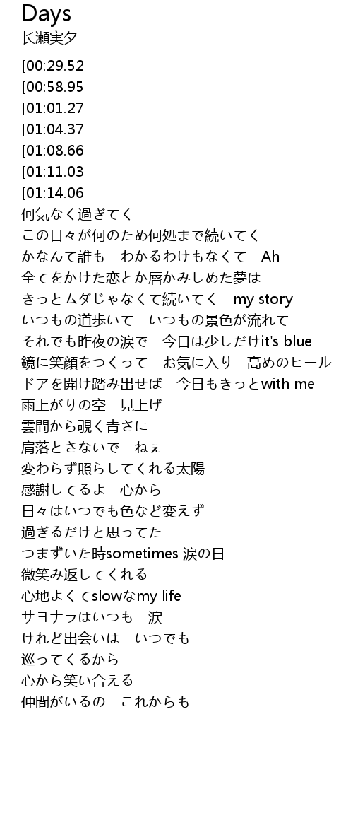 | [00:06.00][00:29.52][02:22.05][03:09.65] | 長瀬実夕-Days |