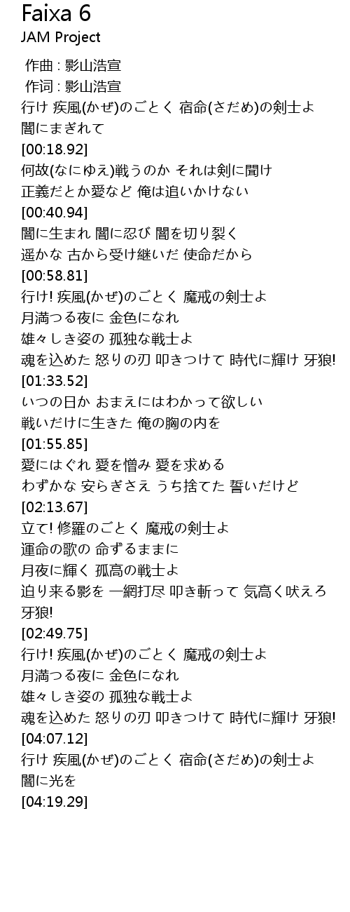 | [03:31.24] | 行け! 疾風(かぜ)のごとく 魔戒の剣士よ |