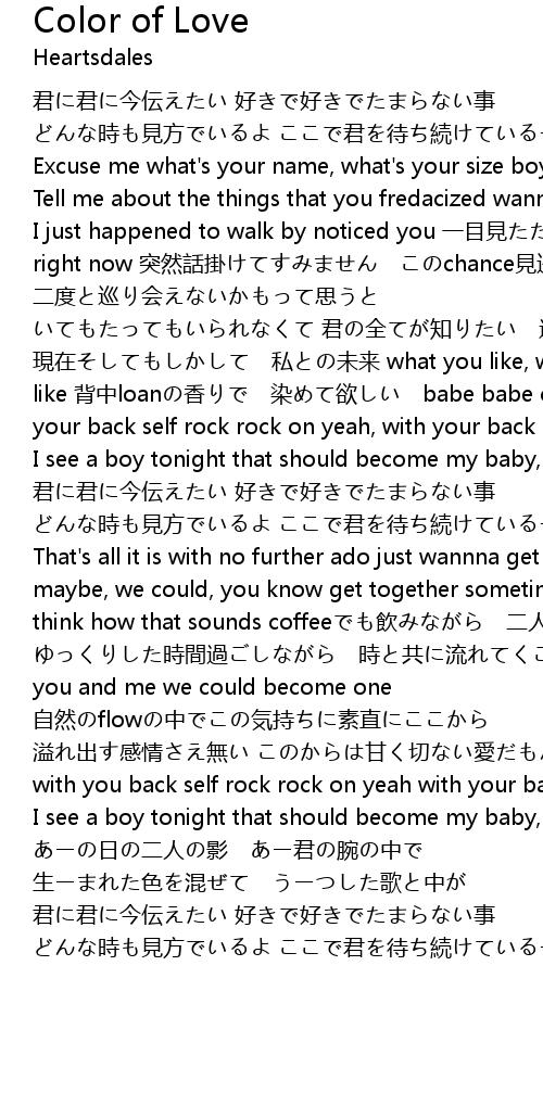 | I just happened to walk by noticed you 一目見ただけで恋に落ちた right now 突然話掛けてすみません このchance見逃したらもう 二度と巡り会えないかもって思うと いてもたってもいられなくて 君の全てが知りたい 過去 現在そしてもしかして 私との未来 what you like, what you don't like 背中loanの香りで 染めて欲しい babe babe come on yeah with your back self rock rock on yeah, with your back self cuz | |