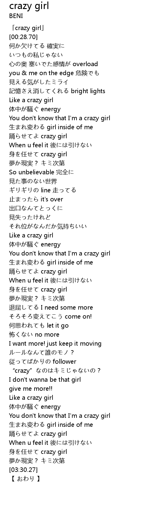 | [03:06.73] | You don' t know that I' m a crazy girl |