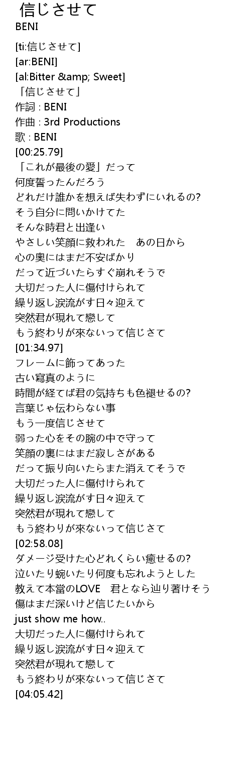 | [01:28.83] | もう終わりが來ないって信じさて |