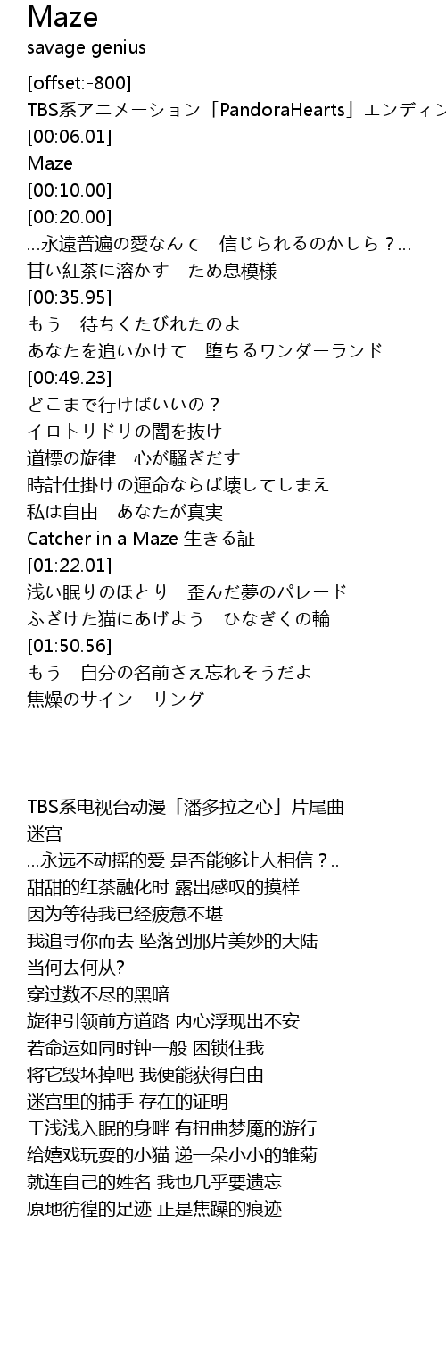 | [00:04.00] | TBS系アニメーション「PandoraHearts」エンディングテーマ |