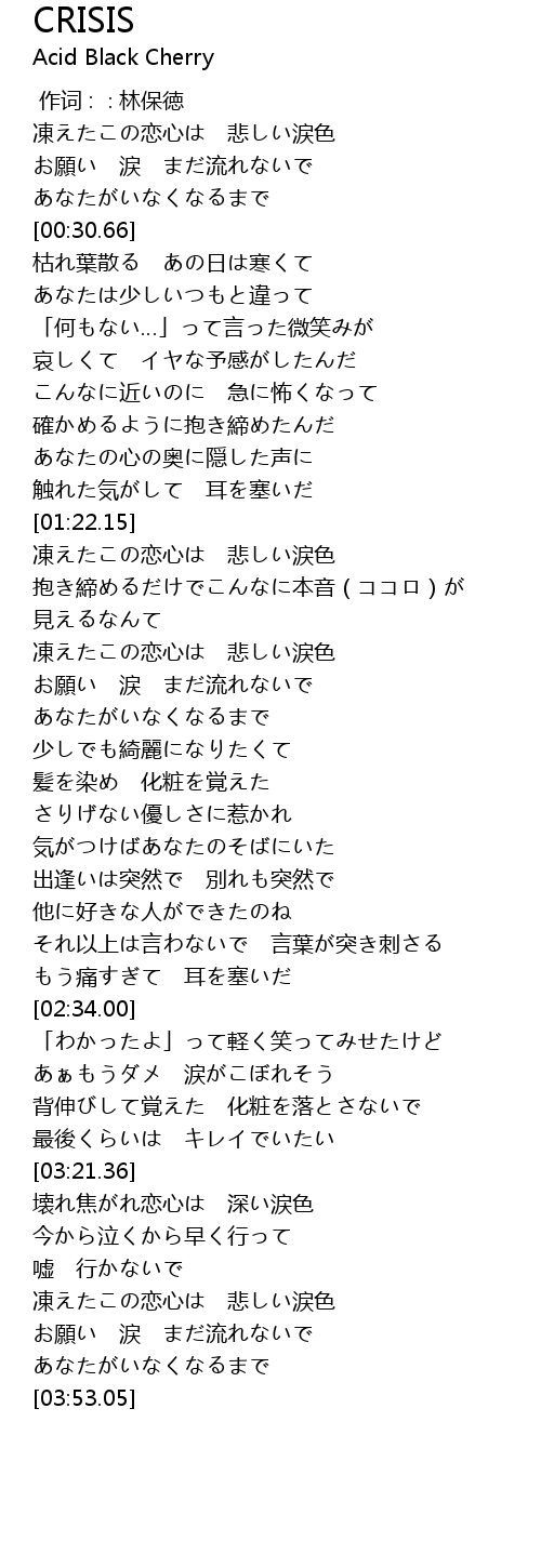 | [03:23.41] | 壊れ焦がれ恋心は 深い涙色 |