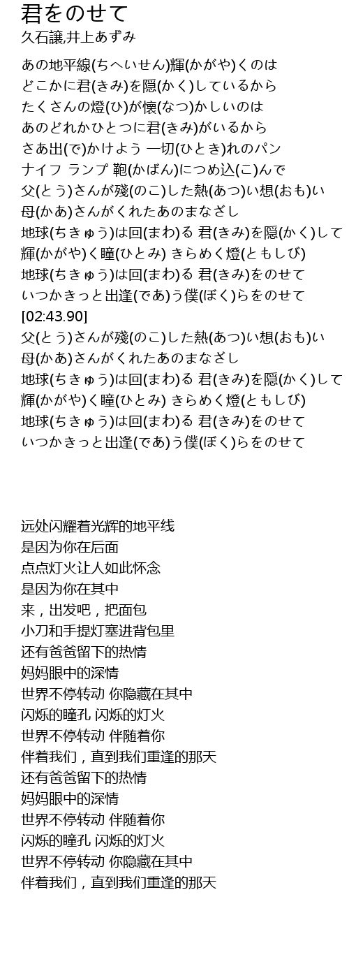 | [02:35.51] | いつかきっと出逢(であ)う僕(ぼく)らをのせて |