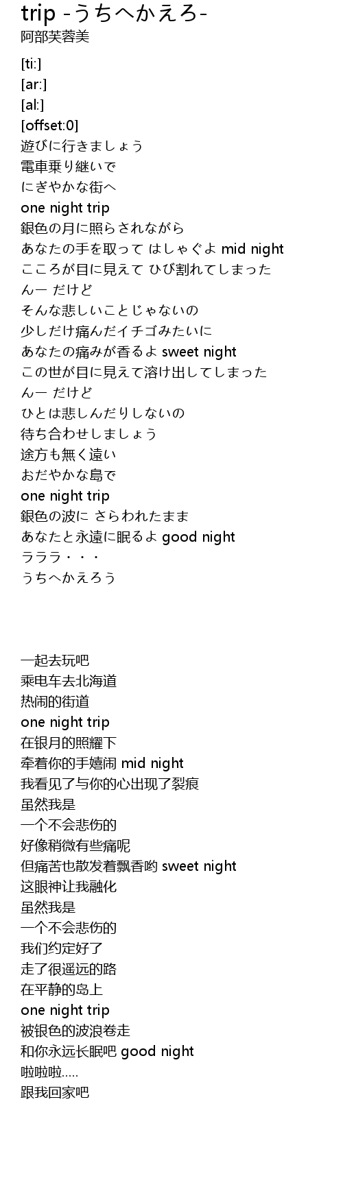 | [00:44.23] | あなたの手を取って はしゃぐよ mid night |