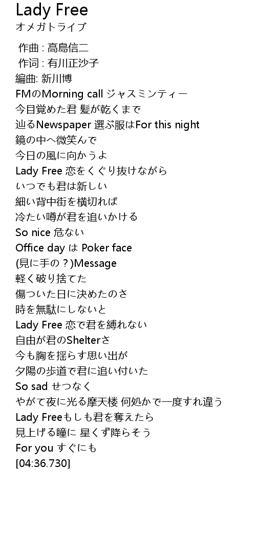 | [01:13.380] | Lady Free 恋をくぐり抜けながら |