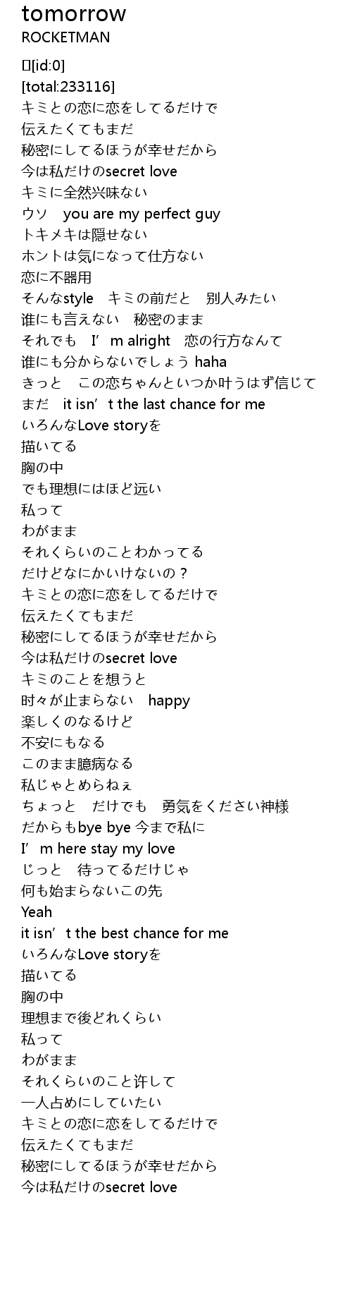 | [03:41.317] | 秘密にしてるほうが幸せだから |