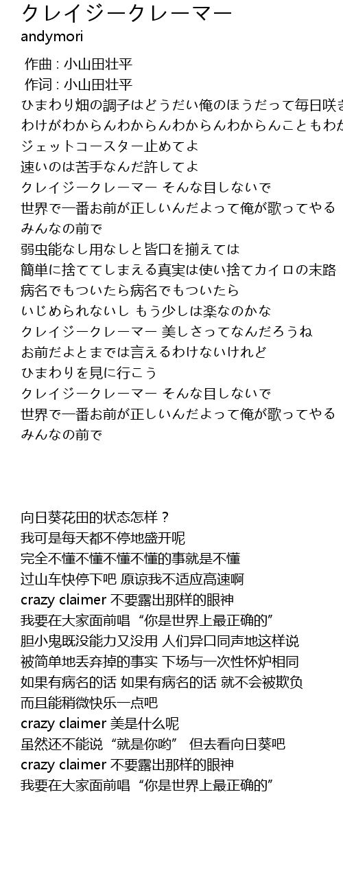 | [01:30.467] | クレイジークレーマー そんな目しないで |