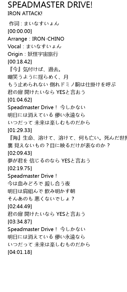 | [01:04.74] | Speadmaster Drive! 今しかない |