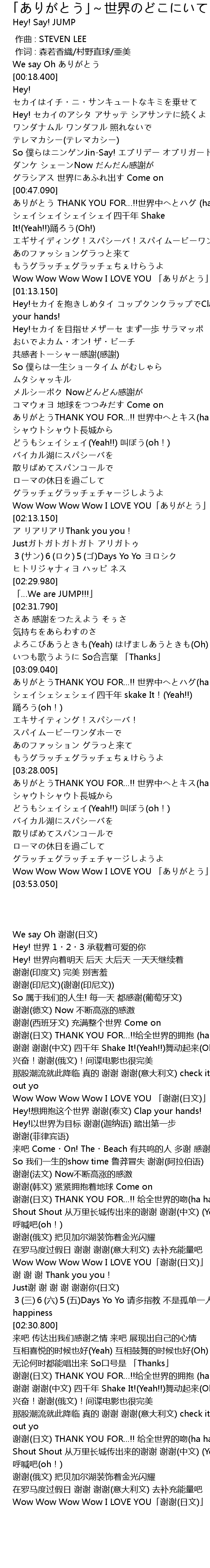 | [03:09.070] | ありがとうTHANK YOU FOR...!! 世界中へとハグ(ha ha) |