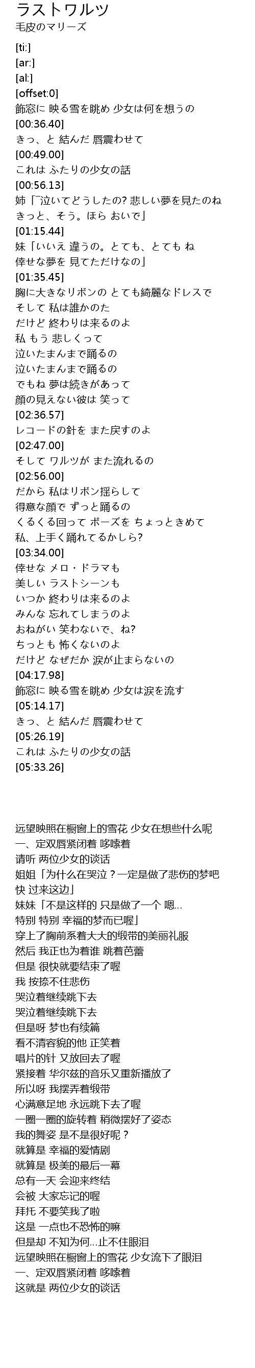 | [00:20.00] | 飾窓に 映る雪を眺め 少女は何を想うの |