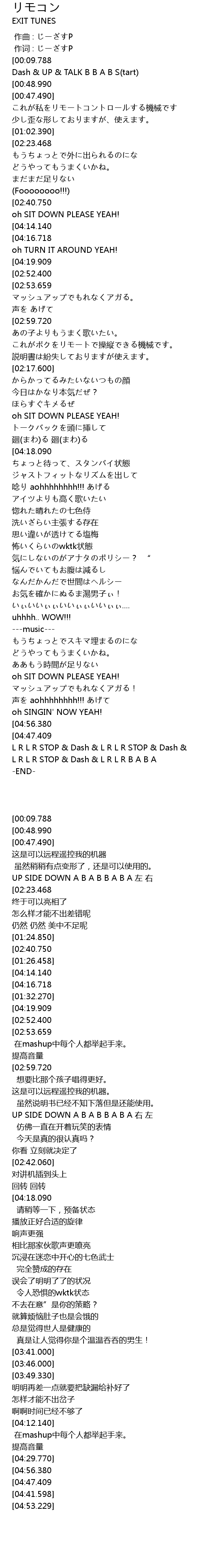 | [01:07.860][02:23.468] | L R L R STOP Dash UP TALK yi chang |
