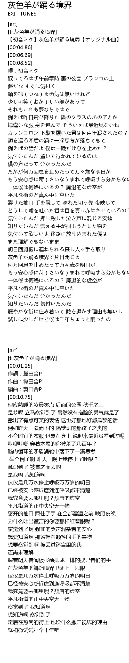 | [00:01.25] | 【初音ミク】灰色羊が踊る境界【オリジナル曲】 |