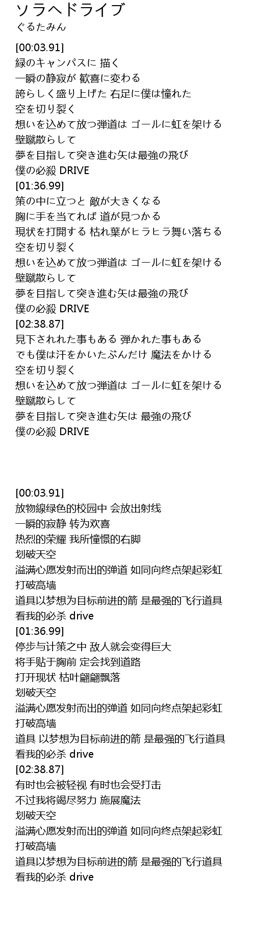 | [02:13.21] | 想いを込めて放つ弾道は ゴールに虹を架ける |