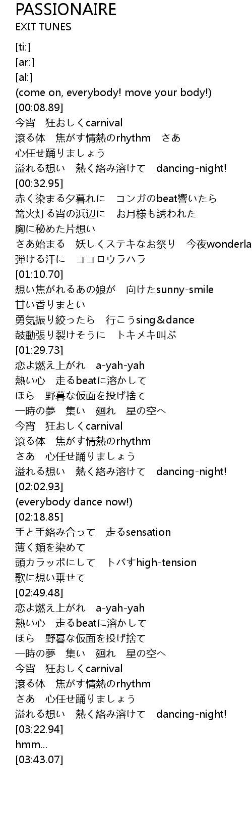| [03:18.00] | 溢れる想い 熱く絡み溶けて dancing-night! |
