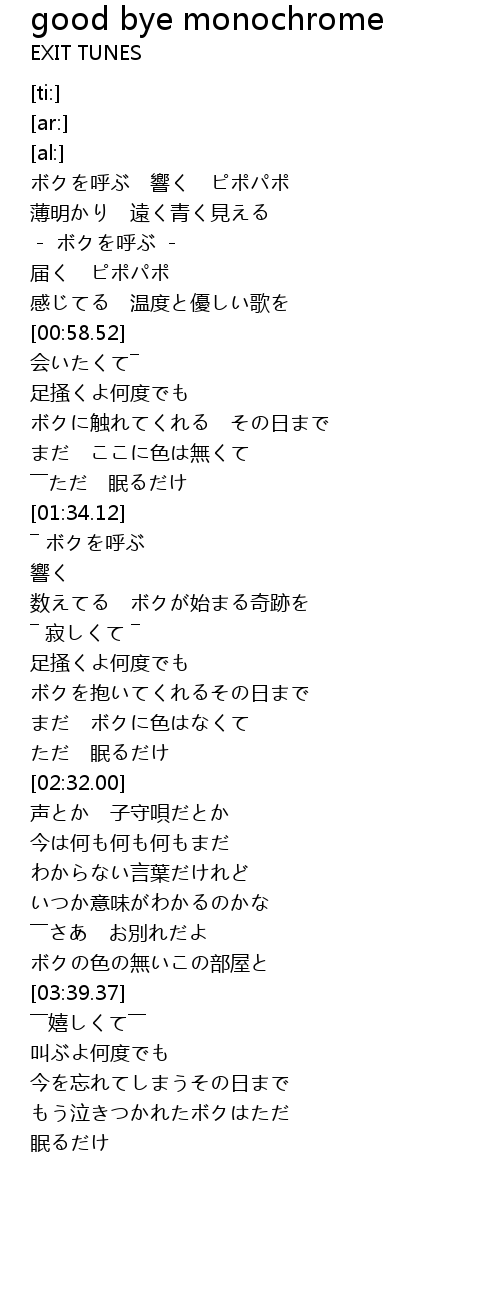 | [03:32.62] | ボクの色の無いこの部屋と |