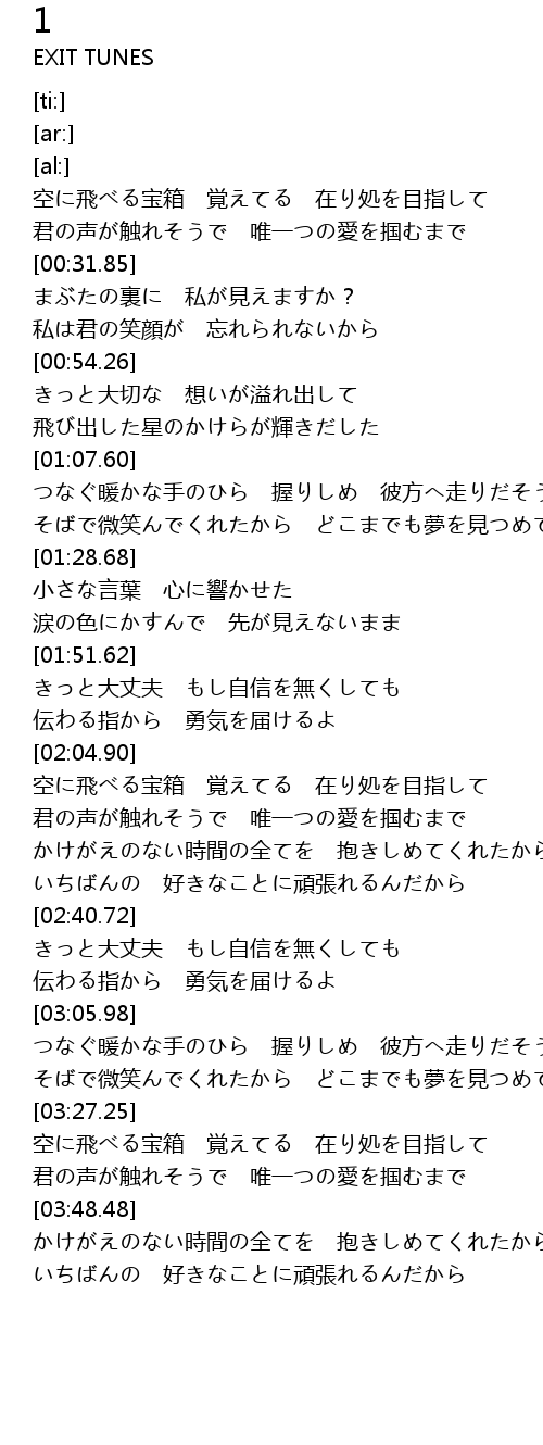 | [03:27.82] | 空に飛べる宝箱 覚えてる 在り処を目指して |