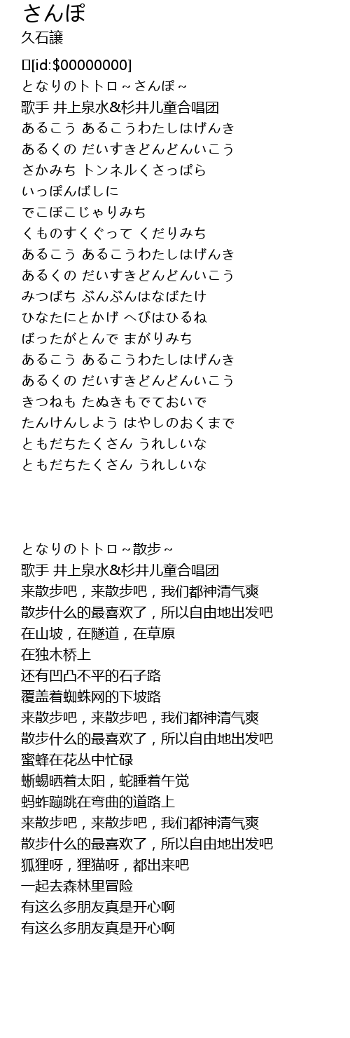 | [00:03.695] | となりのトトロ~さんぽ~ |