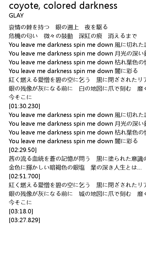 | [00:53.220] | You leave me darkness spin me down 枯れ葉色の憐れみのコヨーテ |
