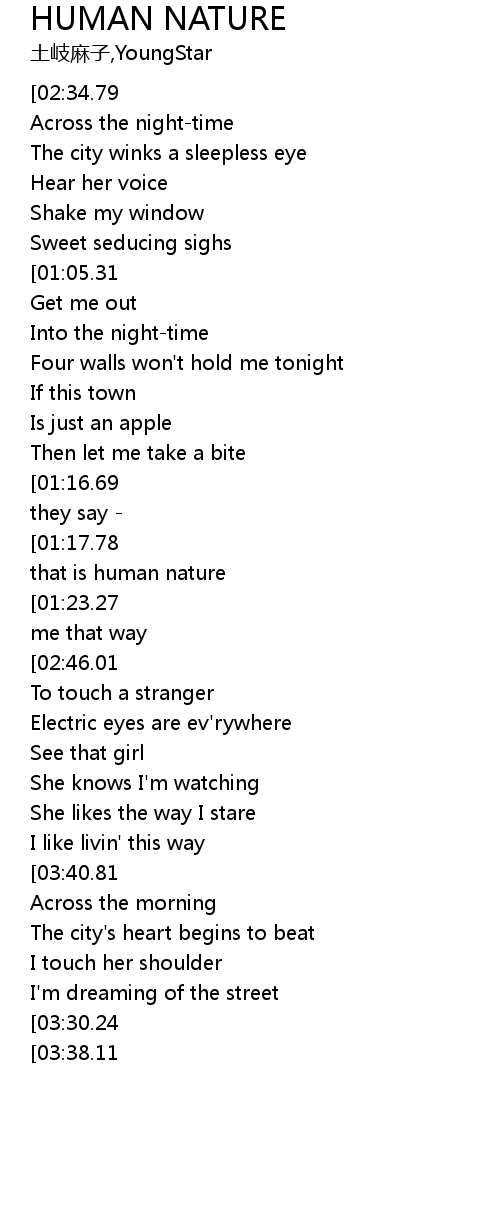 | [01:06.76][01:17.78][01:50.78][02:01.87][02:57.01][03:08.06] | Why, why, tell 'em that is human nature |