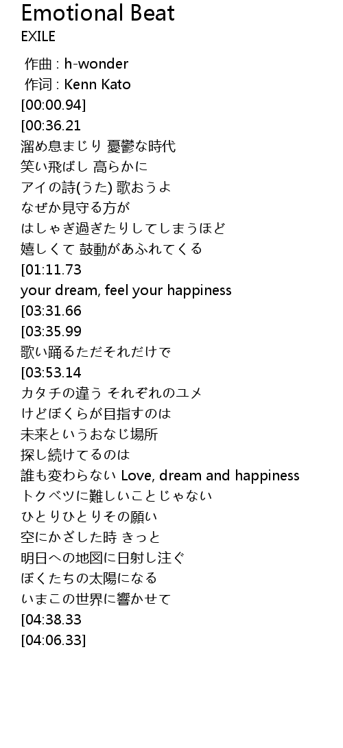 | [00:54.88][01:11.73][02:15.41][02:32.30][03:27.49][03:44.30] | Feel your love, feel your dream, feel your happiness |