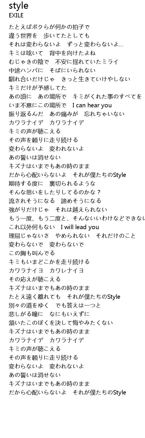 | [02:58.99] | たとえ遠く離れても それが僕たちのStyle |