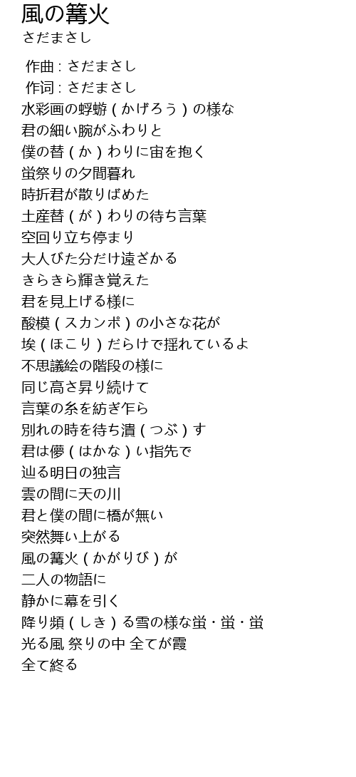 | [03:13.066] | 光る風 祭りの中 全てが霞 |