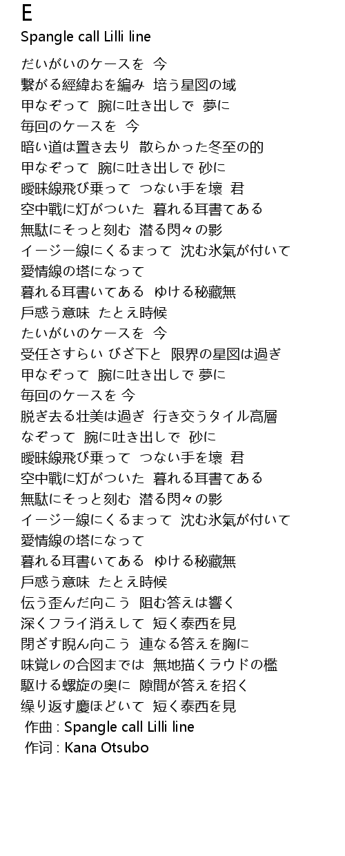 | [00:00.000] | zuo qu : Spangle call Lilli line |