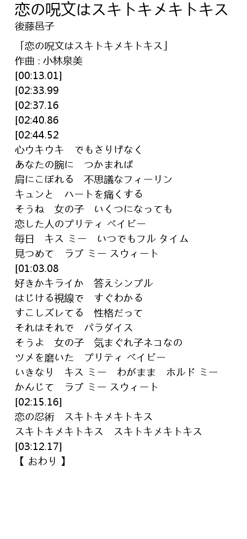 | [02:48.32][02:33.99][02:00.32][01:04.02][00:15.01] | 恋の呪文は スキトキメキトキス |