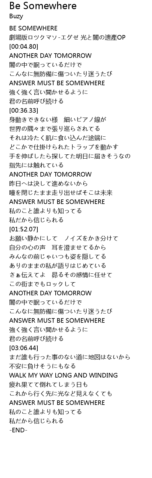 | [00:00.80] | BE SOMEWHERE |